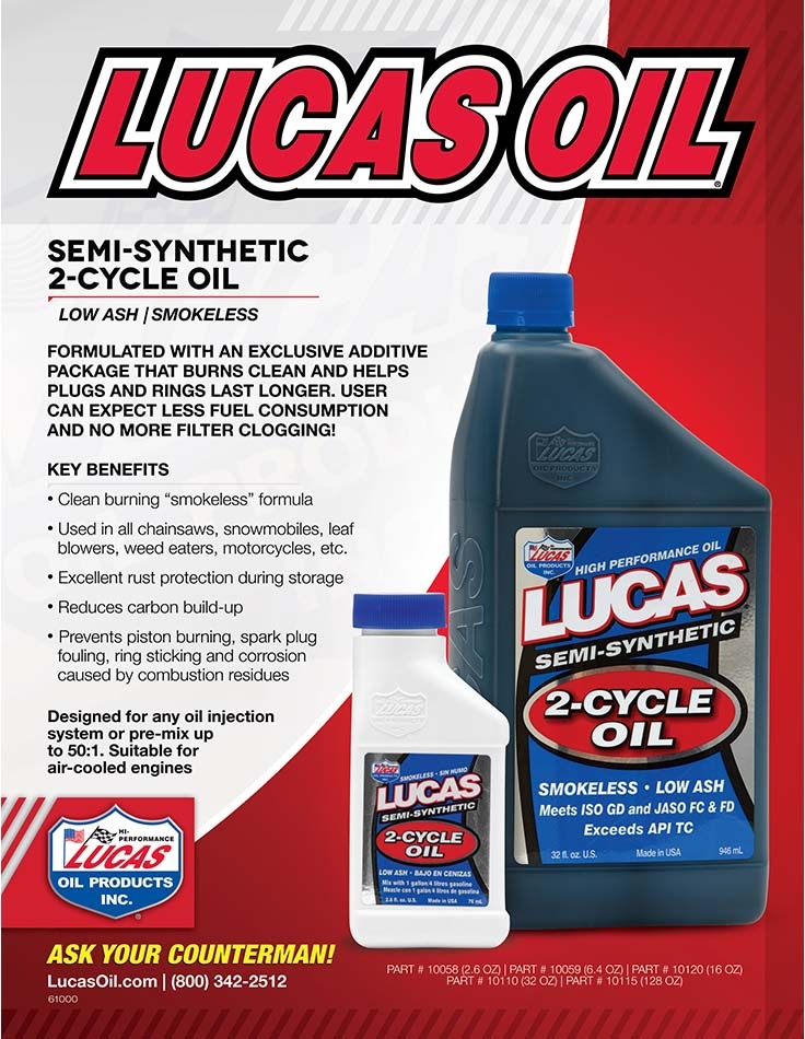 Lucas High Performance Semi-Synthetic 2-Cycle Oil has been specifically developed to give a long trouble-free life to gasoline-powered 2-cycle engines. Designed for any oil injection system or pre mix up to 50:1. Use in Snowmobiles, Weed Eaters, Leaf Blowers, Chain Saws and more.