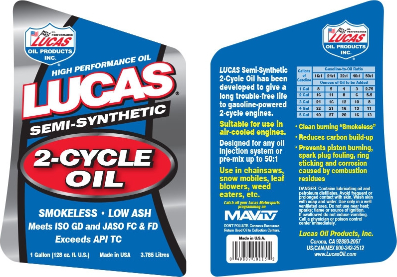 Lucas High Performance Semi-Synthetic 2-Cycle Oil uses an advanced "Smokeless" formula specially blended from mineral oil, synthetic oil and a low ash additive package containing fortified dispersant inhibitors. It also contains exclusive detergents and lubricants. The end result of this advanced technology is a more thorough burning of the fuel resulting in more power and fewer emissions.