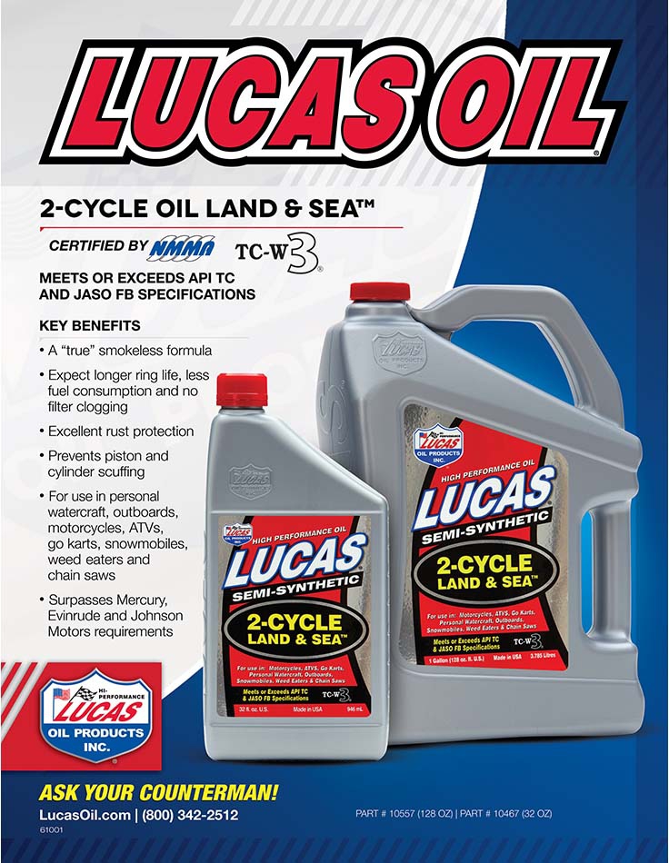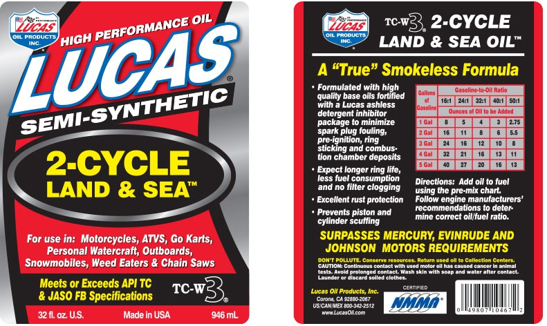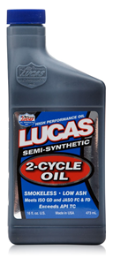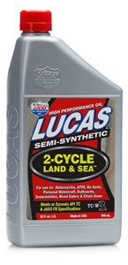 Lucas High Performance Semi-Synthetic 2-Cycle Land & Sea Oil TC-W3 has been specifically developed for Motorcycles, ATVs, Go Karts, Personal Watercraft, Outboards, Snowmobiles, Weed Eaters and Chain Saws. Mix ratio is 50:1.