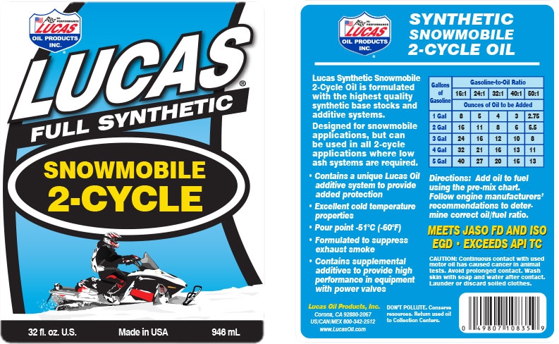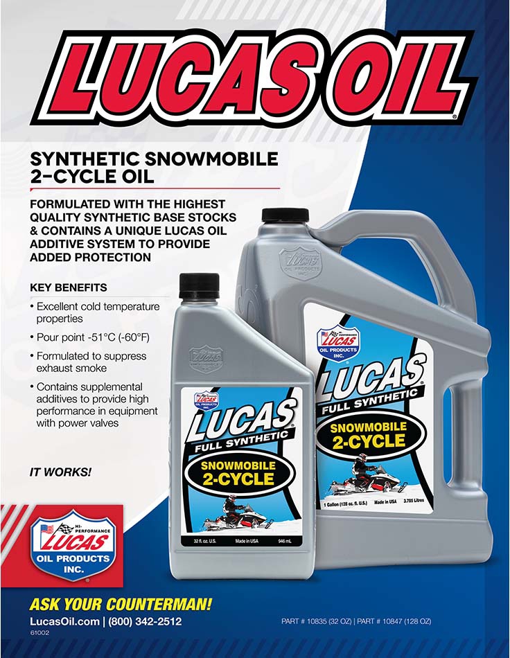 Lucas Synthetic 2-Cycle Snowmobile has been formulated with a special blend of synthetic oils and a low ash additive package to lower exhaust emissions. It also contains a special package of detergents and lubricants exclusive to this formula alone.