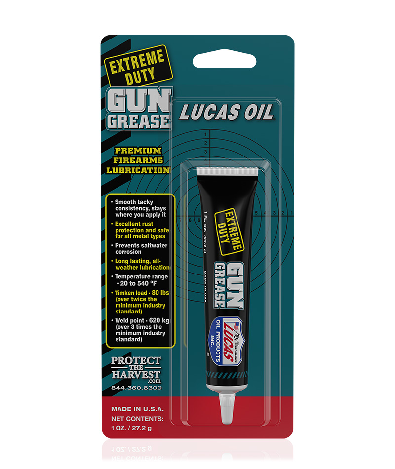 Application to metal surfaces and bores will prevent corrosion during long term storage. Lucas Extreme Duty Gun Grease withstands extreme pressures and cushions metal surfaces with an 80 LB Timken load (35 LB is the minimum industry standard). Lucas Oil Extreme Duty Gun Grease is recommended for all firearm types. It provides excellent lubrication and protection on shotguns, pistols and revolvers as well as full auto carbines, rifles and belt fed machine guns.