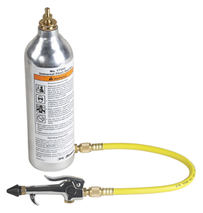 An economical means of flushing contaminants and scale from A/C system components, the flush gun uses dry shop air to pressurize the solvent.