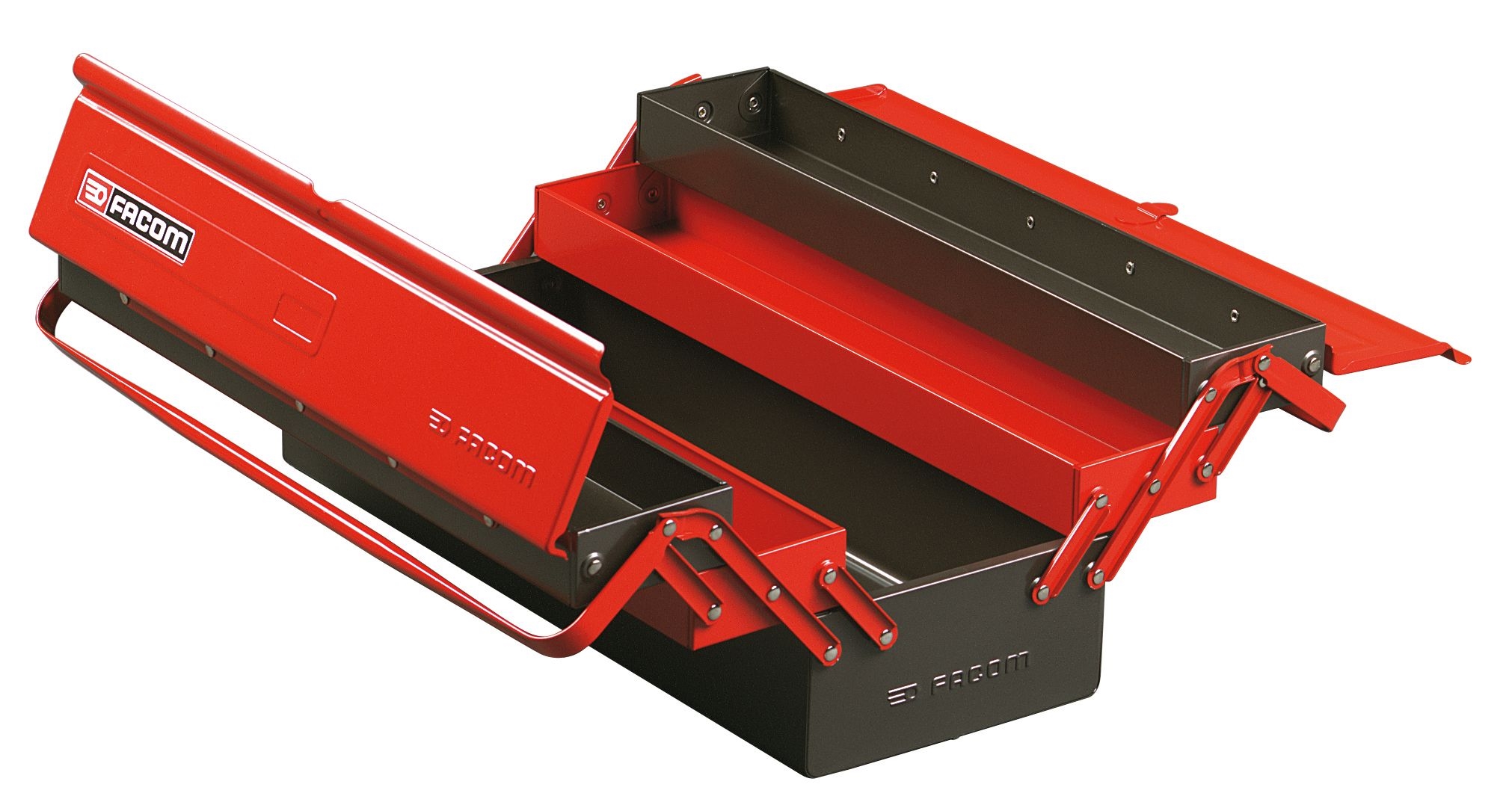 Handles pull apart for immediate access to all trays.