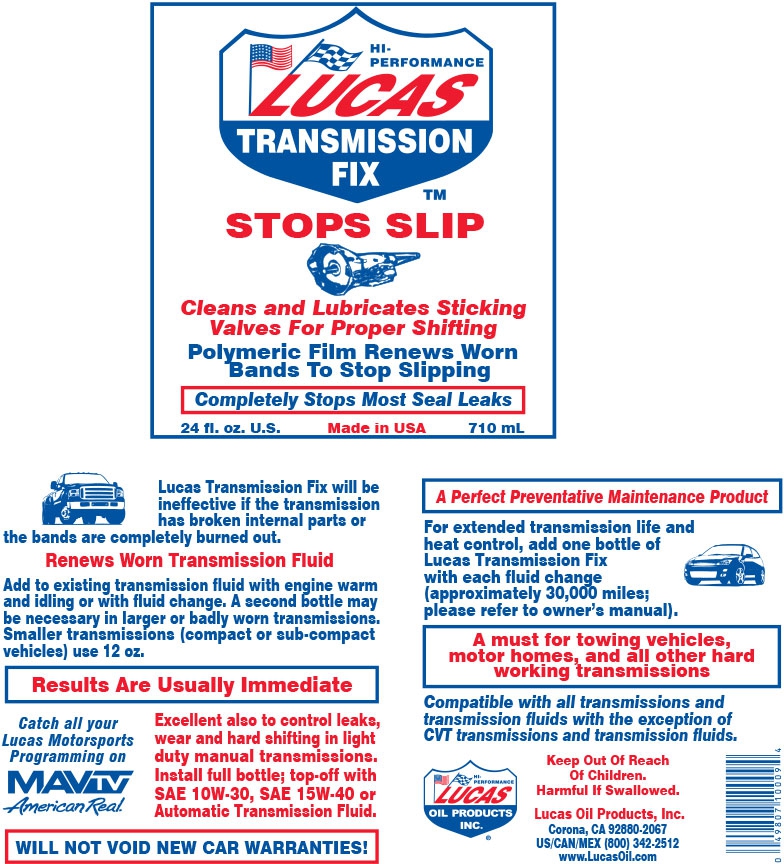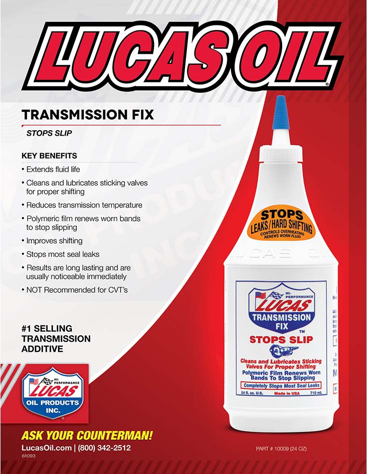 Lucas Transmission Fix is a non-solvent formula that stops slip, hesitation and rough shifting in worn transmissions and completely eliminates most seal leaks. Use in any transmission for preventative maintenance. Use also in light duty manual transmissions to increase shifting ease and transmission life.