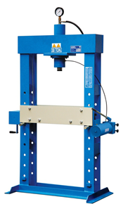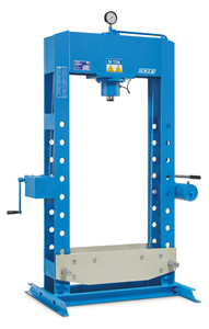 The presses are fitted with a two-approach-speed pump with the automatic return of the ram. By closing the two hand-wheels, one gets the rapid feed. By opening the upper hand-wheel, one gets the high pressure.
