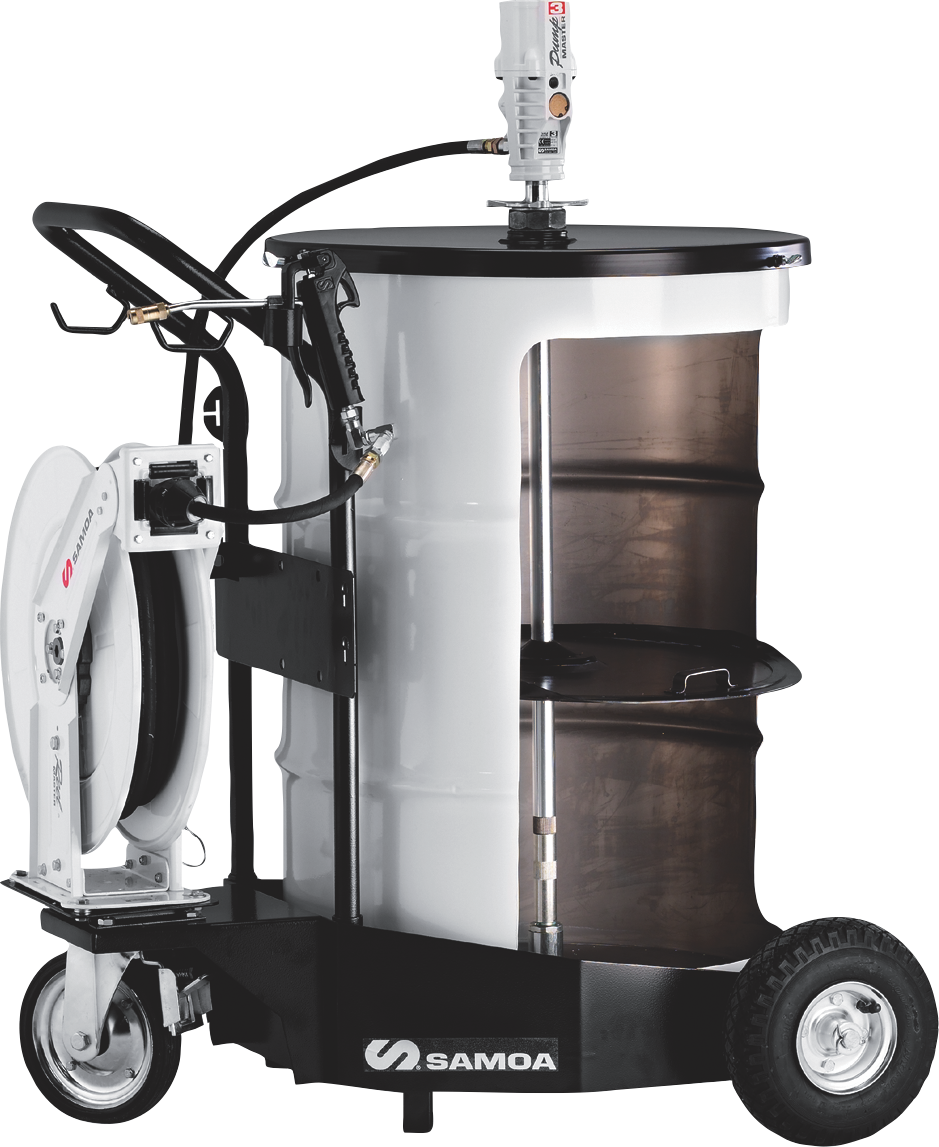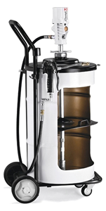 Assembly for high pressure greasing with a PumpMaster 3 - 55:1 pressure ratio pump for 185 Kg drums.