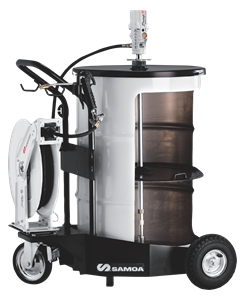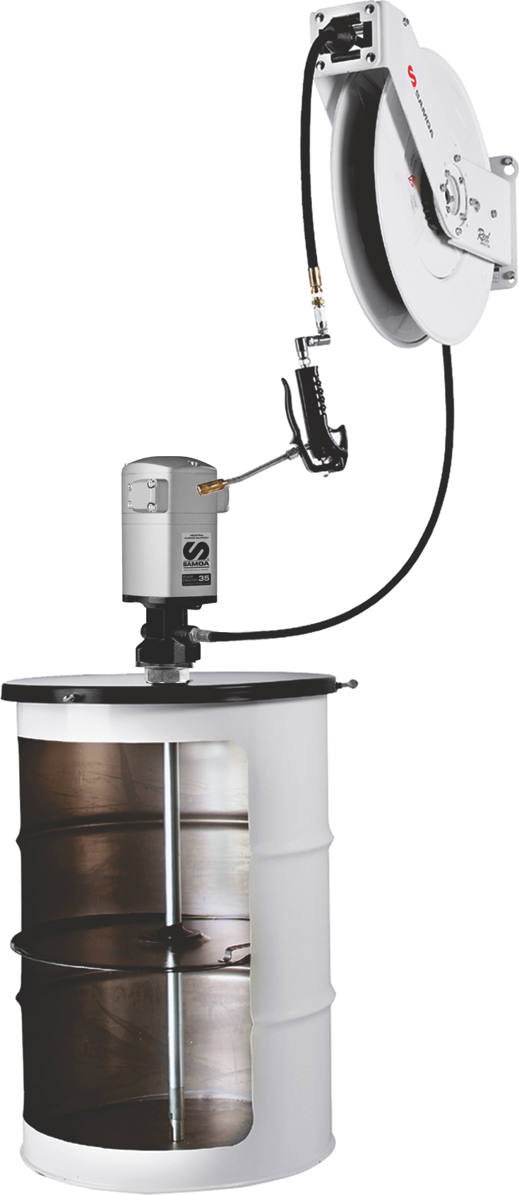 Assembly for high pressure greasing with a PumpMaster 3 - 55:1 pressure ratio pump for 185 Kg drums.